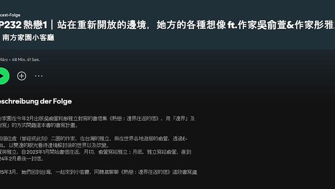 Liu, Tzu-Hua (2025): Aspiration. Authors in Conversation: Through each other's perspectives, we expand each other's lives.《熱戀》作者對談:透過彼此的視角,拓展彼此的生命. Podcast Interview (Chinese) 中文播客訪談. Podcast channel: Homeward Publishing Living Room 南方家園小客廳. Part 1. March 20, 2025.